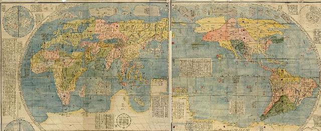 在中國,地圖的發(fā)展也是由本國向外擴散的,畢竟無論在地球哪個角落生活的人,都認(rèn)為自己才是世界中心。如宋朝的《華夷圖》(1136年)就主要描繪了宋朝時的大致地形和主要河流,宋朝版圖以外的朝鮮、越南、蒙古、西藏、新疆等只有簡單交代。隨著時代的發(fā)展,中國人的視野也在逐漸開闊,隨著航海技術(shù)的發(fā)展及鄭和下西游的偉大探索,中國人的足記甚至到達了非洲。這在《大明混一圖》中有較好的證明,在該圖中,日本、印度、中亞、非洲甚至歐洲都有所體現(xiàn)。而后隨著利瑪竇等西方傳教士的到來,還出現(xiàn)了著名的《坤輿萬國全圖》,該地圖中增加了南北美洲、南極洲等區(qū)域,而且描繪更加科學(xué)精確,已經(jīng)與現(xiàn)代世界地圖非常接近。當(dāng)然,世界的中心肯定還是中國(明朝)啦。